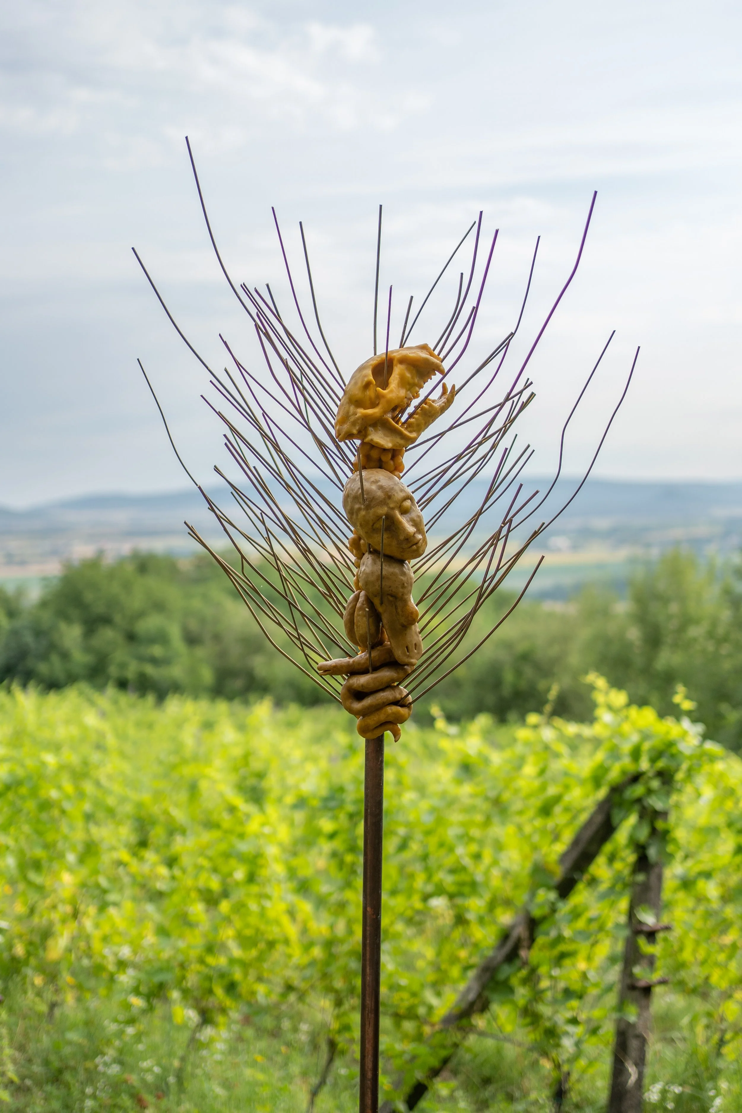 It sticks to whoever passes by it, penetrates their clothes or fur, their skin, or any orifice it can find, causing great pain and serious inflammation. Despite the repressive image of mother nature, our concept of nature was never feminine. Nature is masculine, nature is brutal. It has no mercy. It is extroverted, able-bodied, virile, aggressively healthy and heterosexual. The master-narrative of most theories of evolution is heterosexist as well, centered around reproductive sexual penetration. When it comes to nonreproductive sexual behaviour, it has been linked to hierarchical systems, not in terms of pleasure but as signals of dominance and submission. We might even not realize how widespread this dominant, heteromasculine portrayal of nature is. Nature seems very useful for keeping the spirit of patriarchy alive. The idea of domination by strength and fertility are often referred to in our social situations. We call male leaders alpha-males when in reality in wolf packs it is the female wolves doing the caring and reproductive work that are the leaders. In reality all living things on our planet are rather queer. The practices of queer-ecology aim, in different ways, to disrupt prevailing heterosexist discursive and institutional articulations of “natural sexuality“. Most plants are hermaphrodites, making both pollen and seeds, pollinated by the help of animals or wind, never touching each other. Animals are far from being heterosexual as well. 10-20 percent of female bears are intersexual. They mate and give birth through the tip of their penis. Here, on this safe volcano that is not going to erupt again anytime soon, you are facing a large metal pole. It has spikes on its top, in between them you see specific natural symbols that culturally we claim to be masculine and feminine: a snake, a swan, a seed and a bear's skull with a human head in the middle of them. The reason for them being impaled is left up to your interpretation. The fact that they are made out of beeswax is not negligible either. Beeswax has much queer qualities: it is sensitive, it can take on many shapes to adapt but it is also highly resilient, just like LGBTQ+ communities. With time the beeswax will completely disappear from the pole, becoming a part of the ecosystem of the hill, leaving its rigid host behind for the gaze of the hikers who wander around on the Szent György-hill.