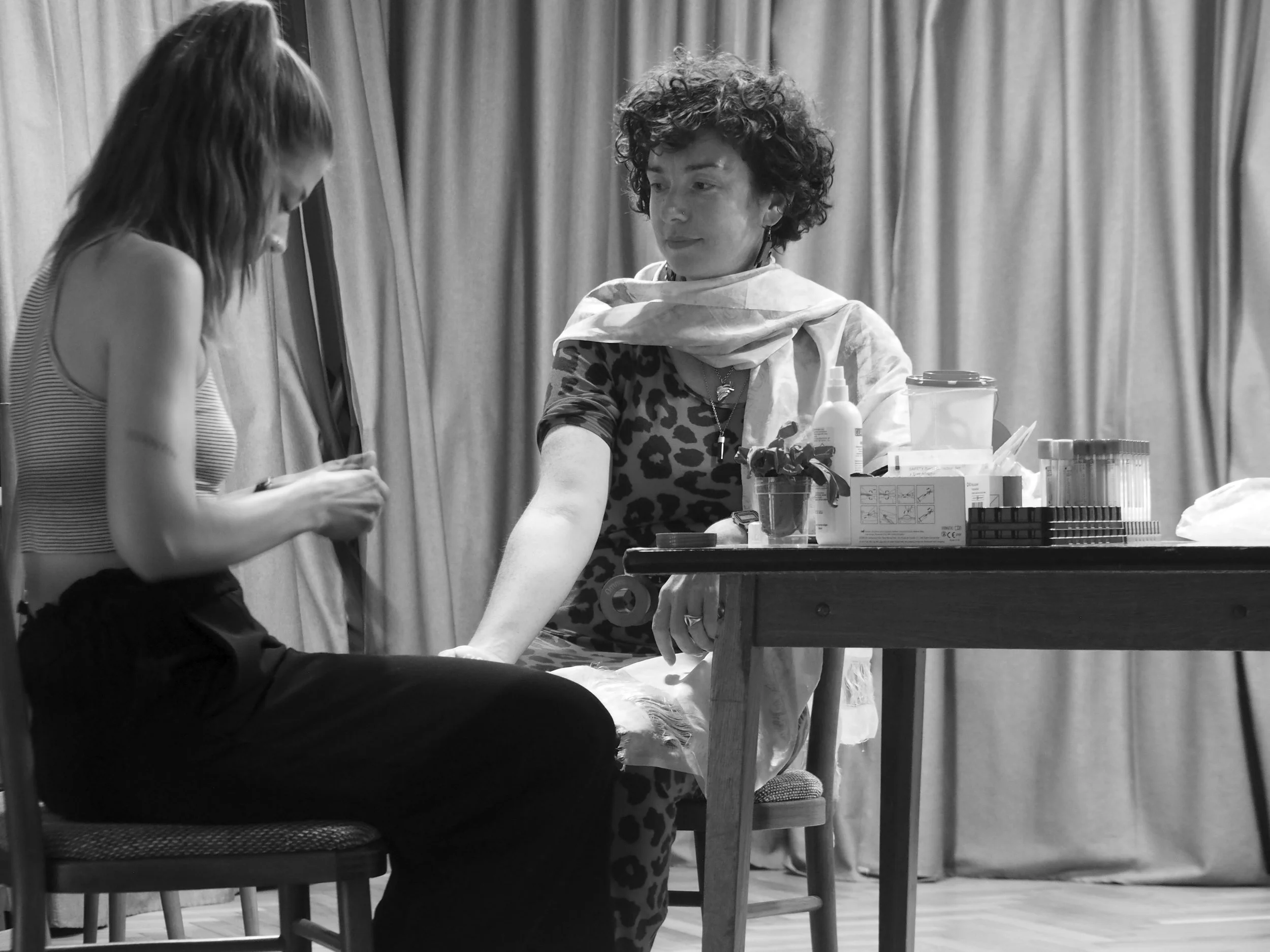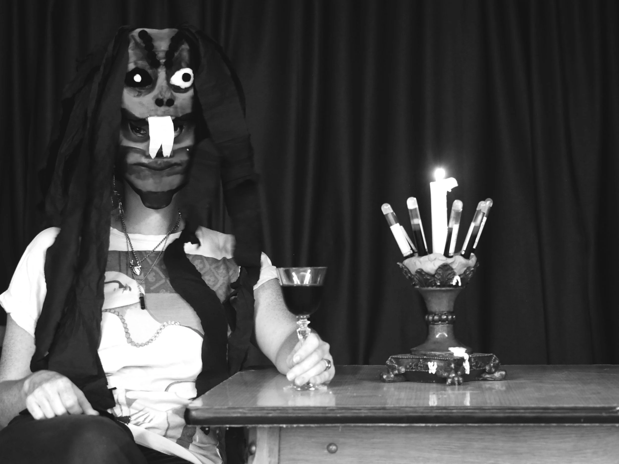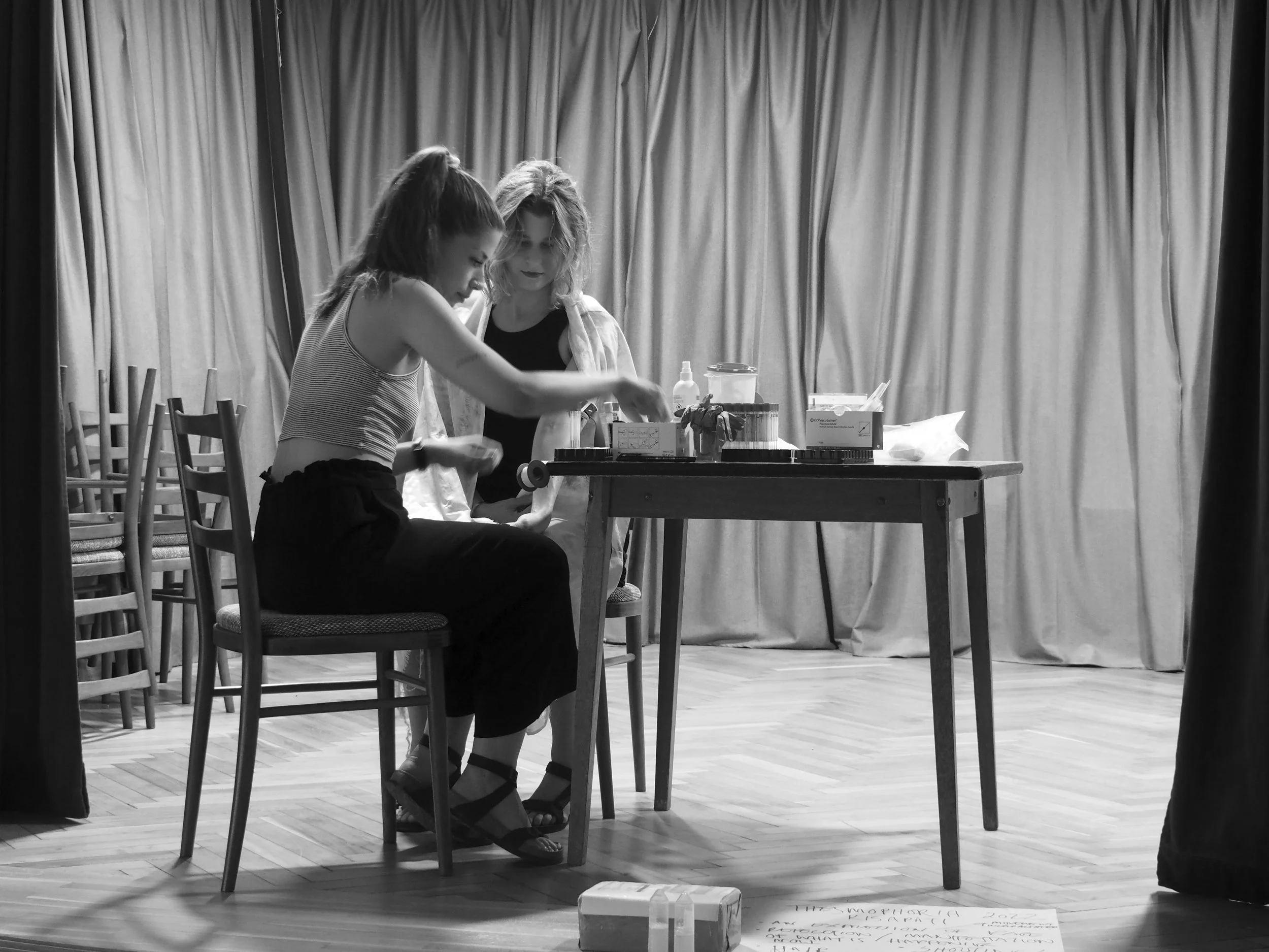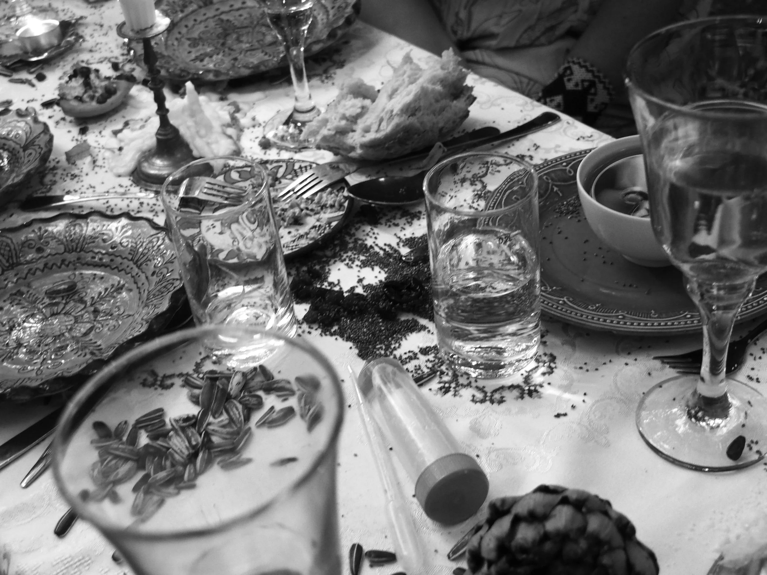 The installation contains evidence of a feast – a table set for dinner, laboratory equipment where the plasma was created, a displayed container of the plasma, and the artefacts from the reenactment of Thesmophoria.