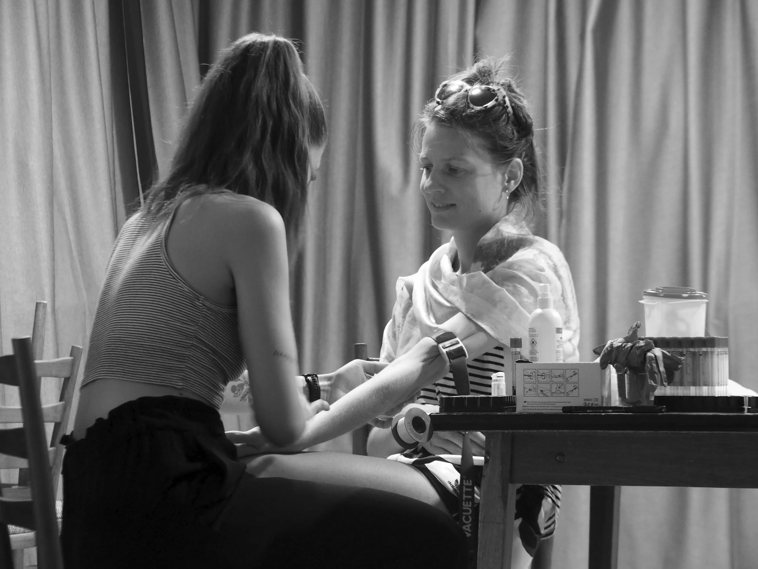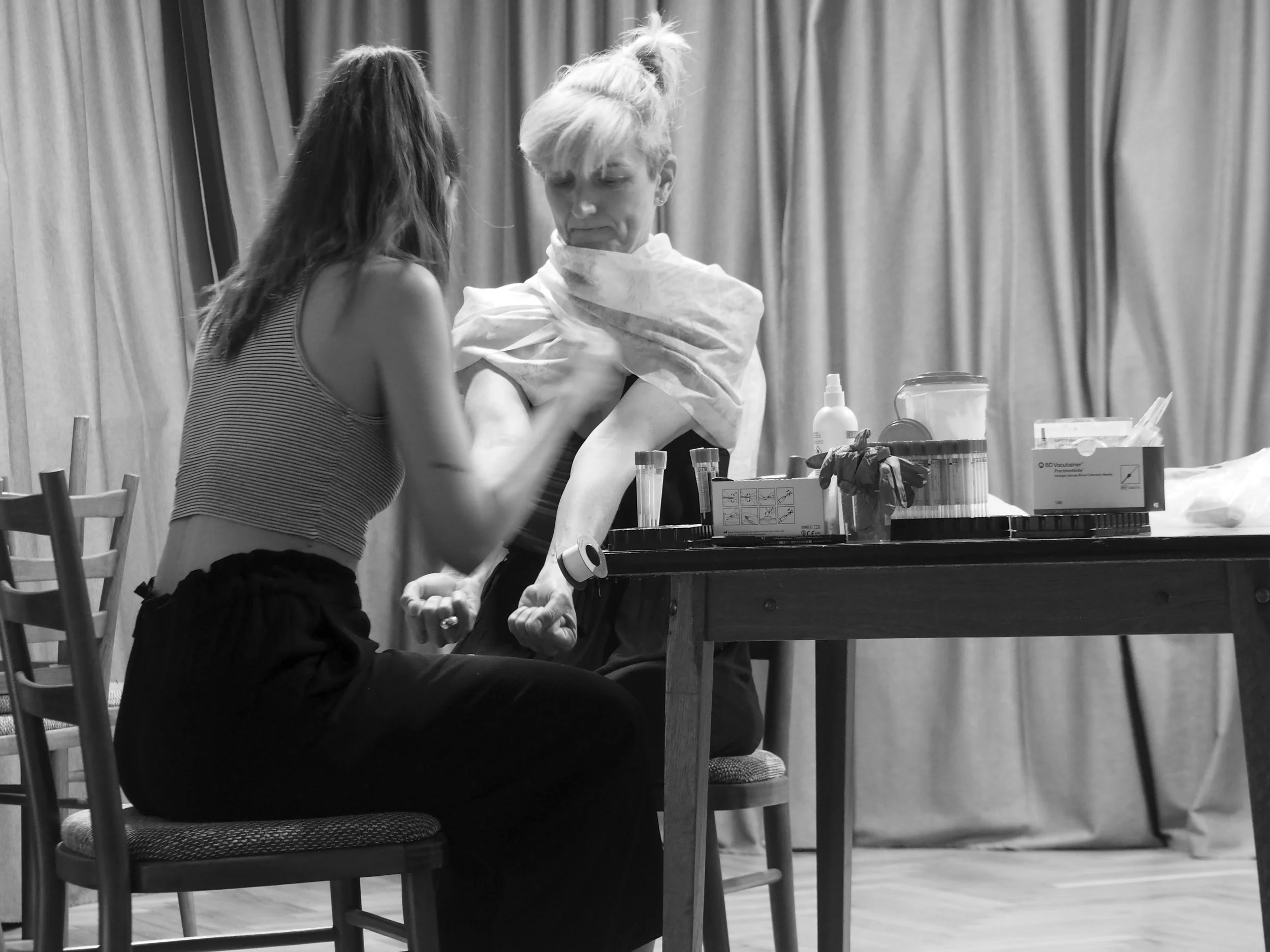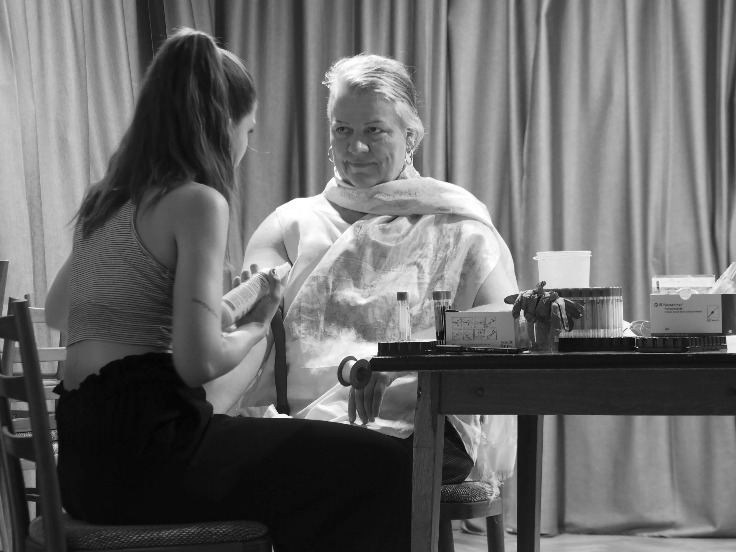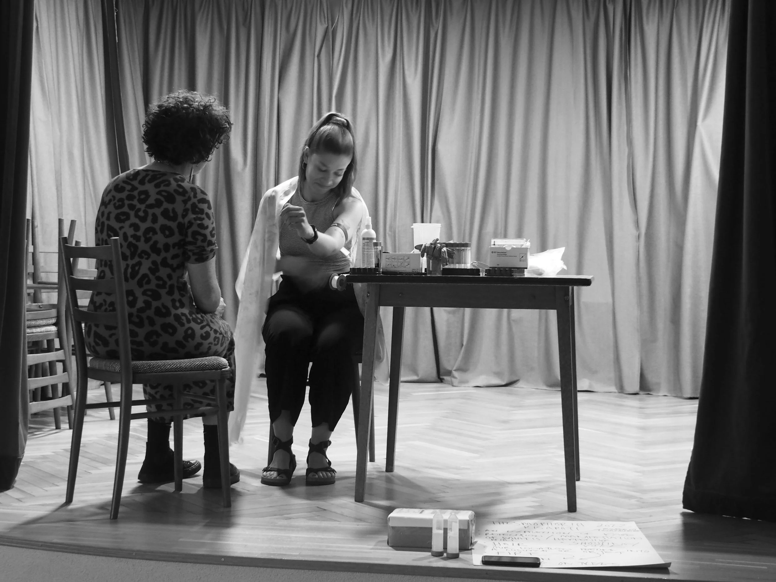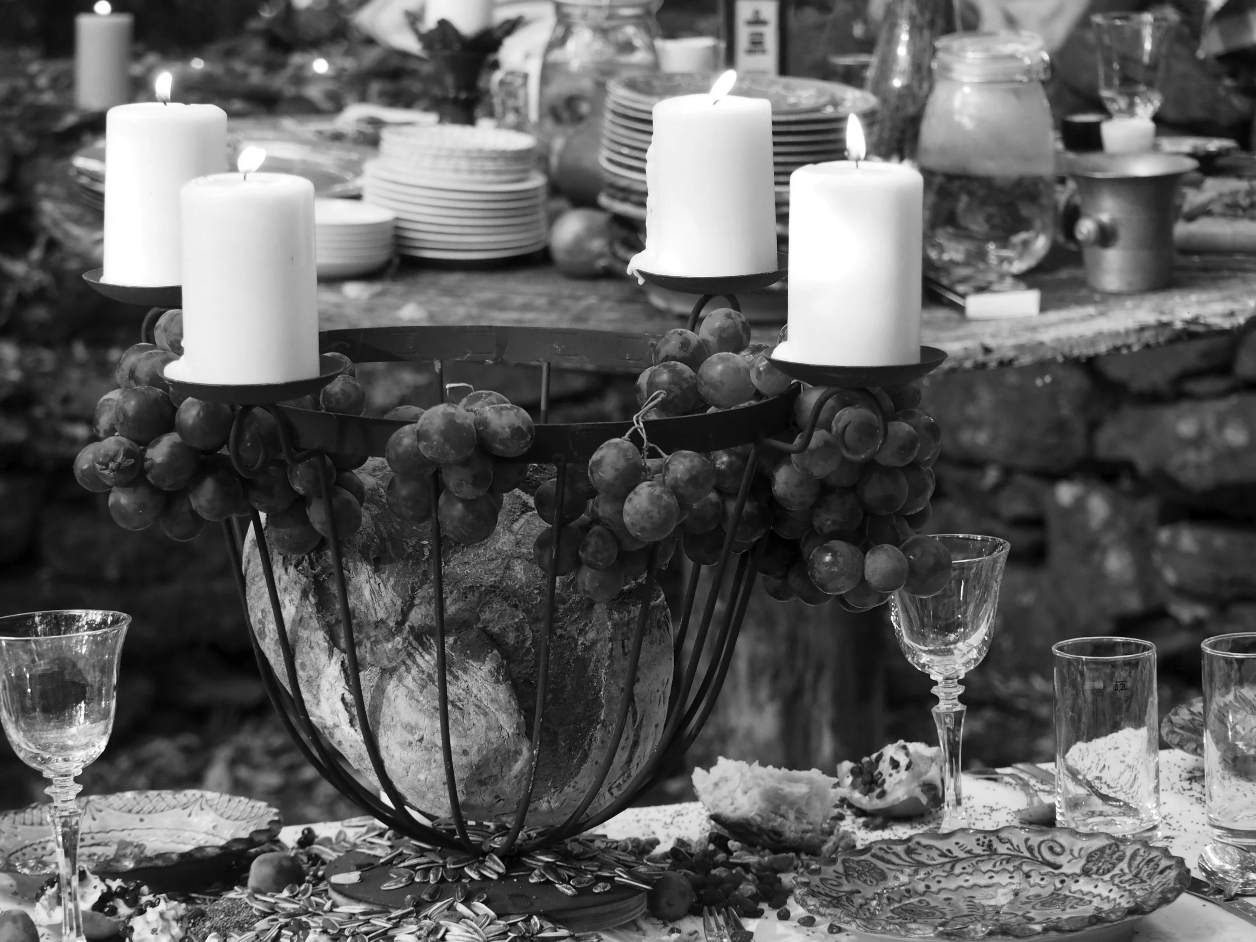The installation contains evidence of a feast – a table set for dinner, laboratory equipment where the plasma was created, a displayed container of the plasma, and the artefacts from the reenactment of Thesmophoria.