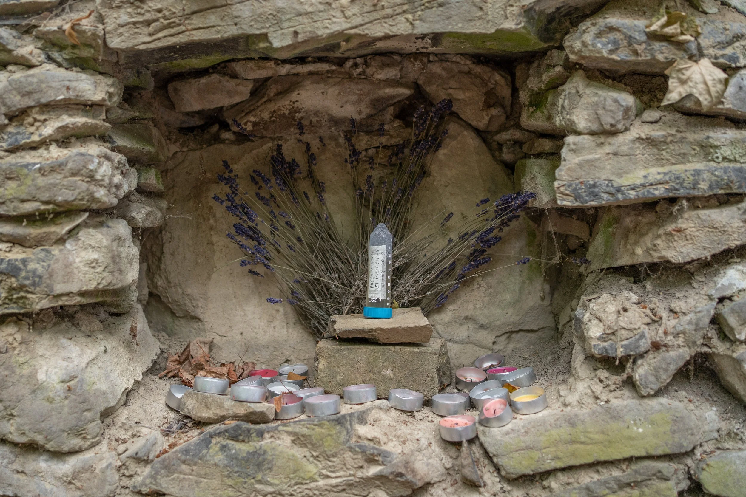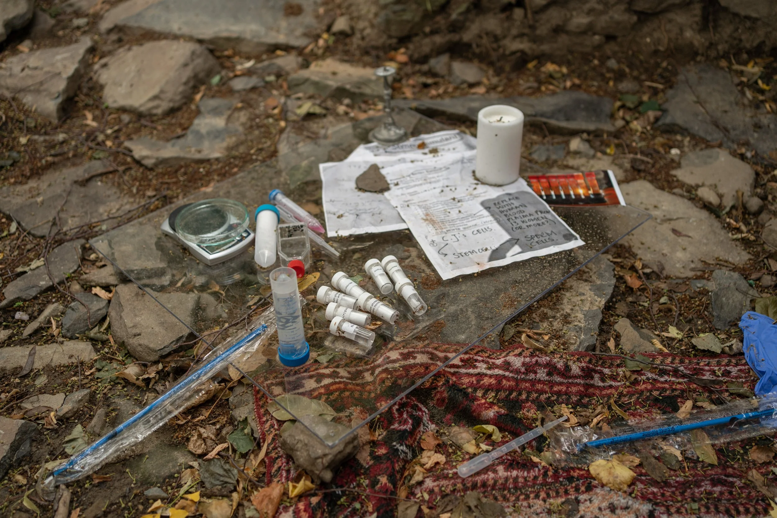The ruin’s walls frame the installation, which can be observed from standing above the building on a hill slope. The performative part of the artwork is a reenactment of the festival, where local women gathered for 3 days collectively performing “secretive” rituals in nature and creating the displayed artefacts in the site. The key artefact is a genetically created plasma that contains cells of the artist and multiple donors, which are part of the largely funded genetics research investigating different ways in which human cells can be modified for fertility (University of Leiden).
